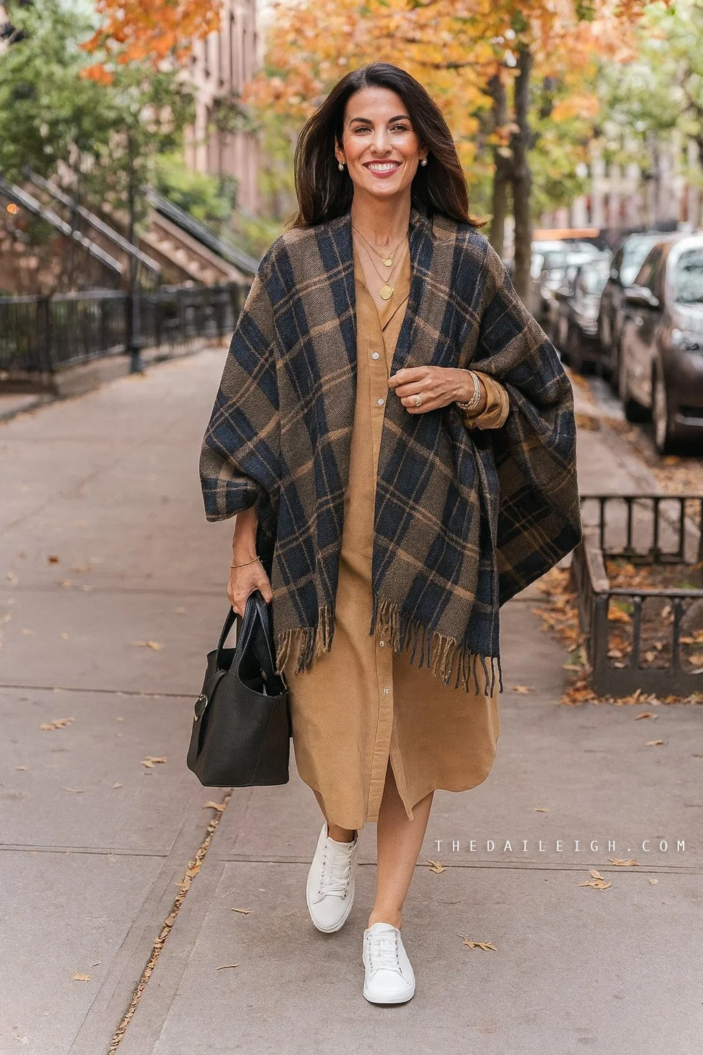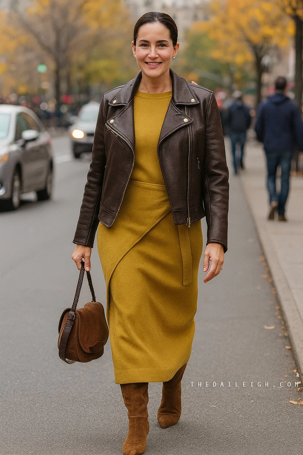Corduroy instantly gives off that cozy, fall-ready feel. Whether you’re wearing a shorter style or a maxi dress, this fabric easily transitions from a day of errands to the office and even a night out. Since corduroy already offers the comfort and warmth you crave in the cooler months, you don’t need much to complete your look—just add a denim jacket, a trendy barn jacket, or an oversized layer to finish it off.