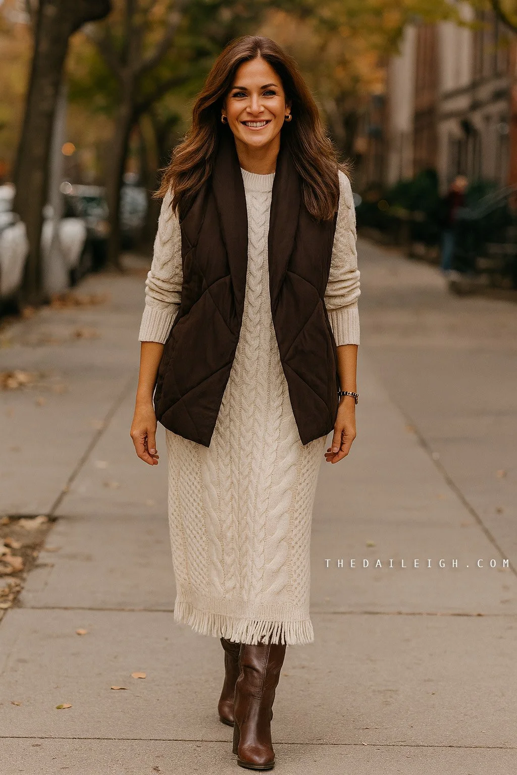 As we transition into the colder months, I know many of us tend to pack away our dresses or wear them less, turning to jeans instead throughout fall and winter. But why? Sure, dresses may not seem as cozy or warm as other pieces—but when styled the right way, they absolutely can be. With the right layers, textures, and accessories, you’ll see just how versatile and year-round dresses truly are. After all, how boring would it be to only wear them in the warmer seasons? From chunky knits and tights to boots and outerwear, there are endless ways to make any dress feel fall-ready.