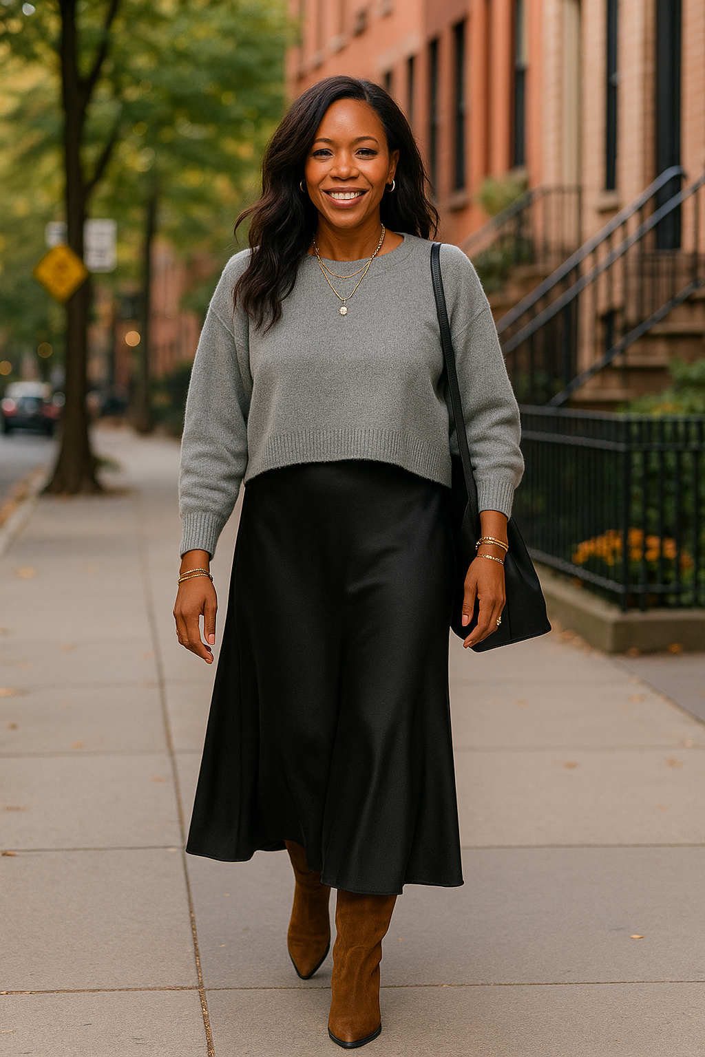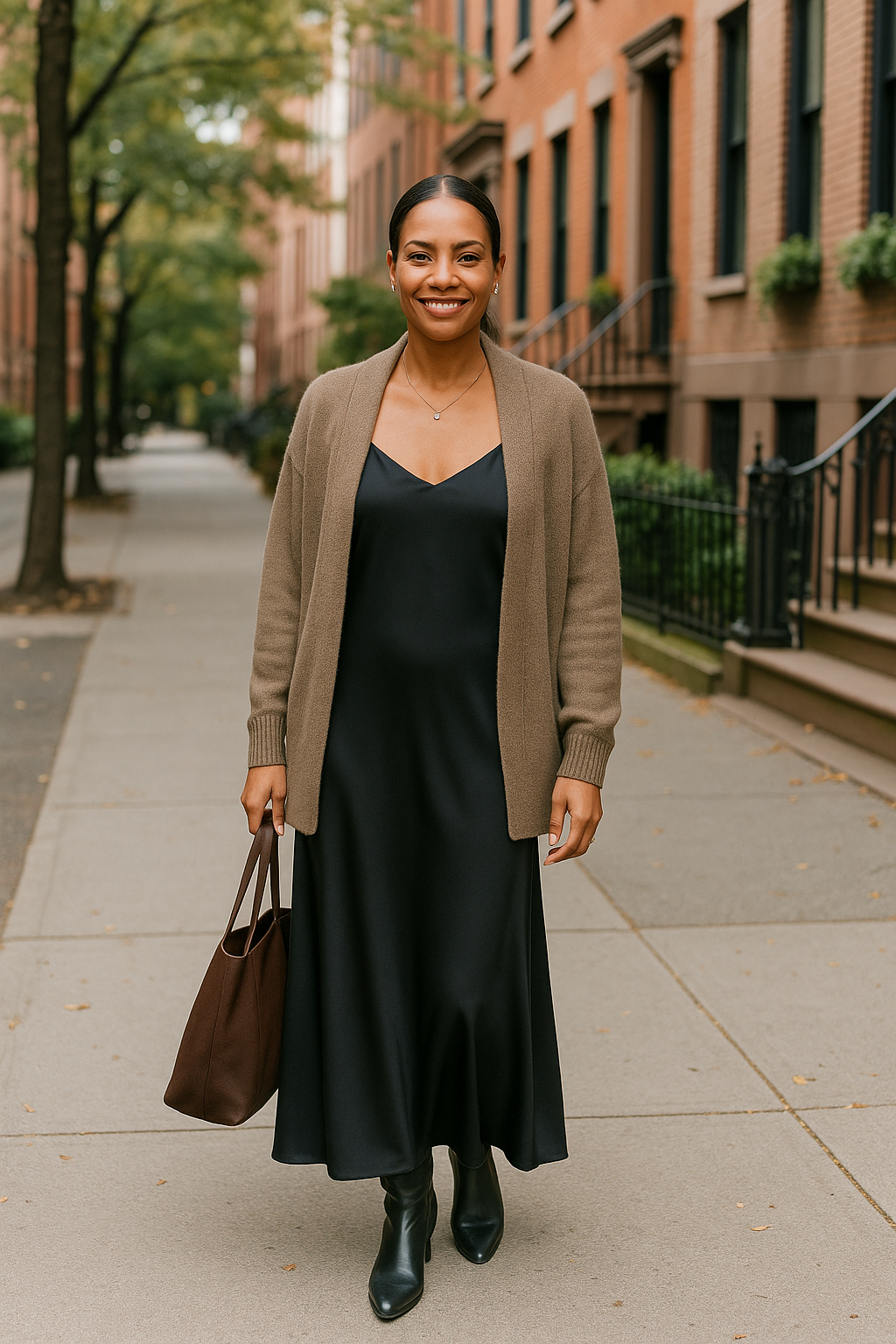 If a slip dress on its own feels a little too bare, don’t rule it out just yet—there’s always a solution. One easy way to make it feel more comfortable (and stylish) is by layering. Try draping a lightweight sweater over your shoulders for an effortless, chic touch. It adds coverage without hiding the sleek look of the dress. See? You don’t have to skip styles you love—you just have to find ways to make them work for you.