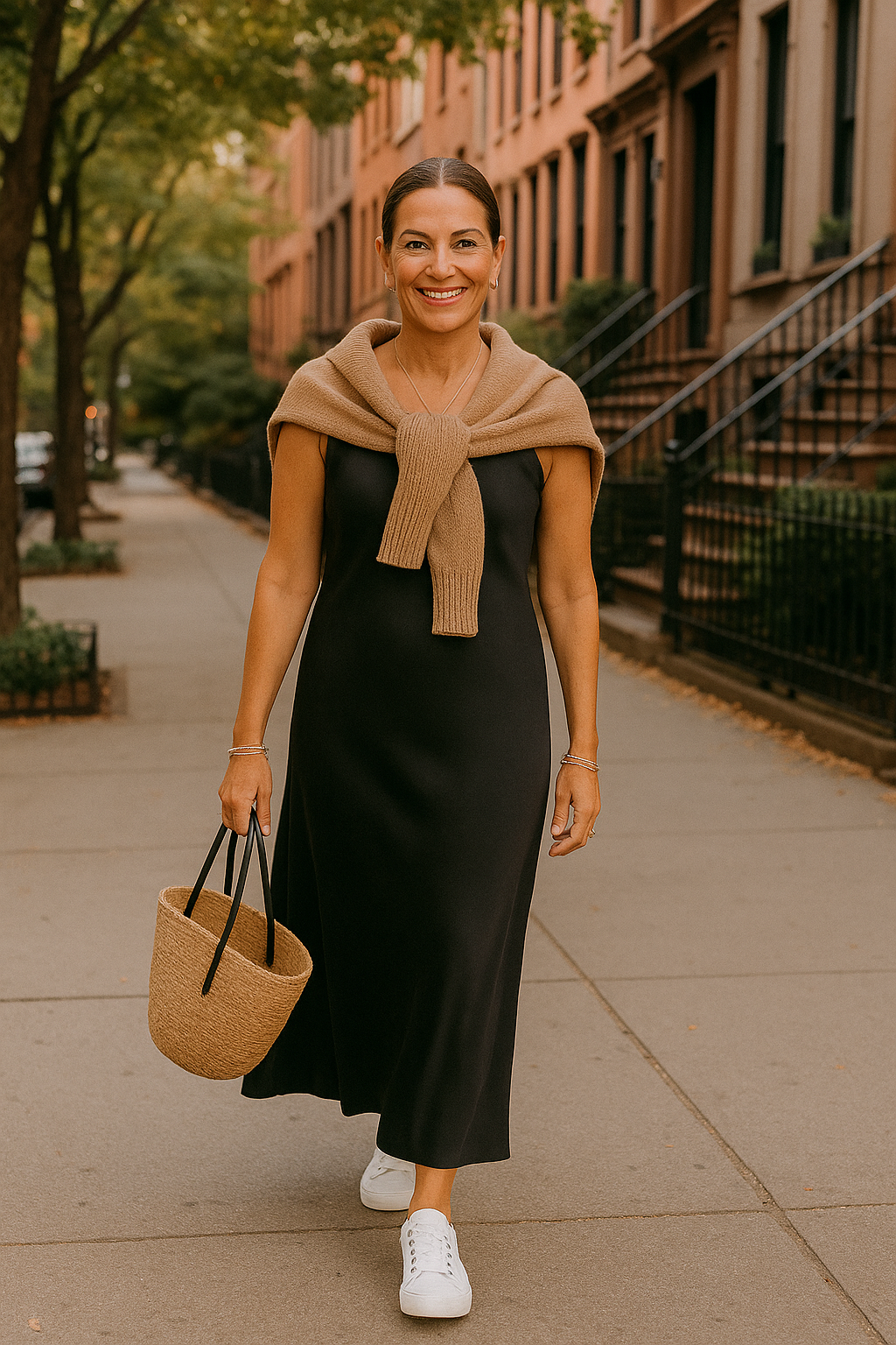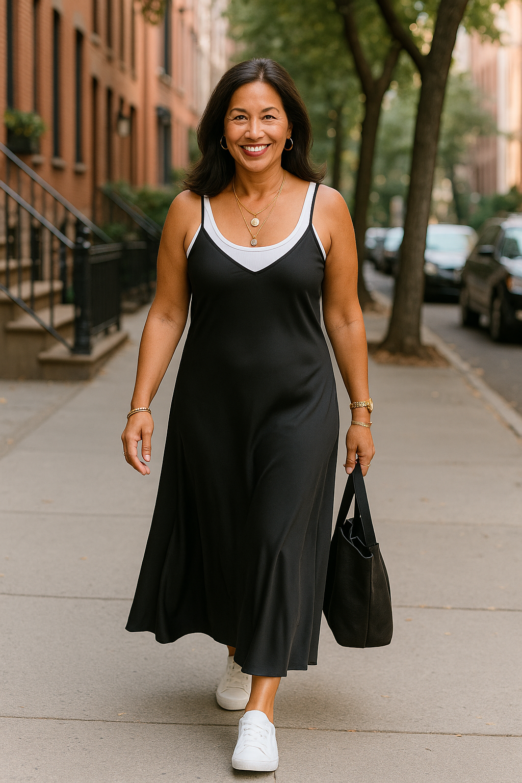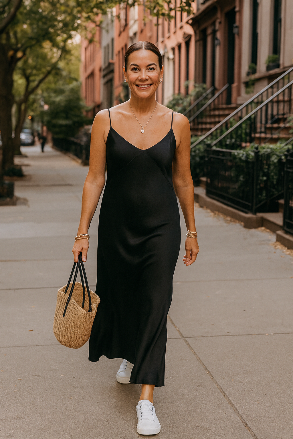 A slip dress is the perfect choice for days when you want to look polished but still keep things casual—and when you want a break from your go-to jeans-and-tee combo. One of the easiest ways to dress it down is with sneakers. White sneakers, a wardrobe essential, are always a favorite because they’re chic and give any outfit a fresh, effortless vibe. While other colors work too, white sneakers add a timeless yet trendy touch. Their clean, simple style complements the slip dress without overwhelming it the way chunkier, busier sneakers might. And of course, no outfit is complete without a stylish hairstyle and a little jewelry to pull everything together.