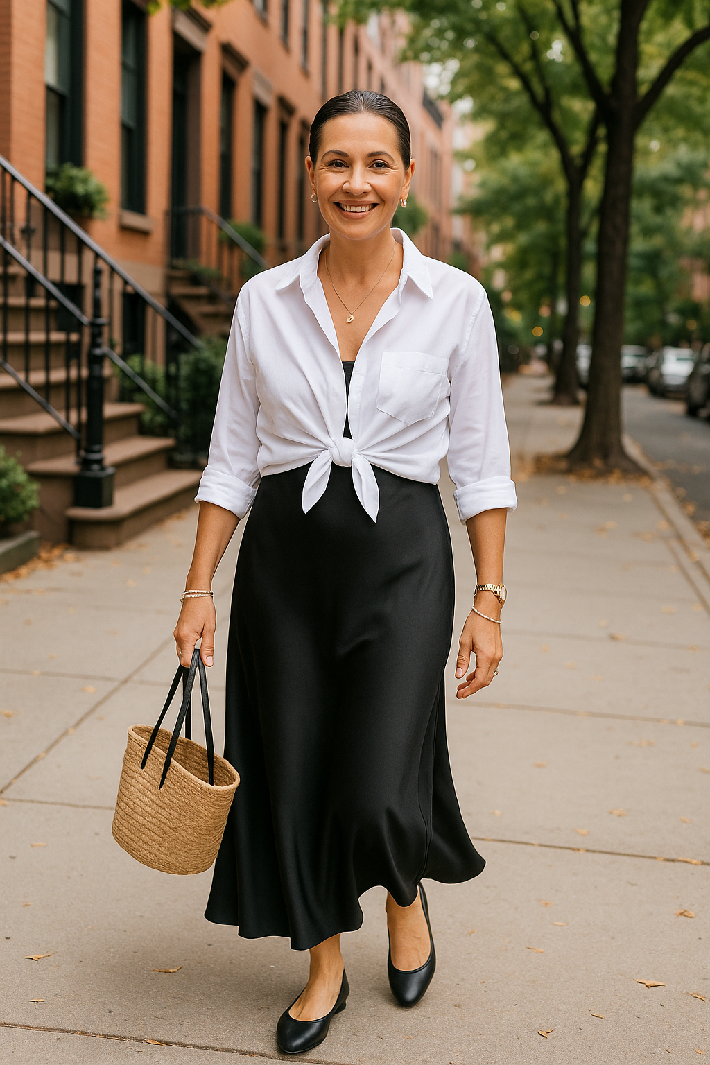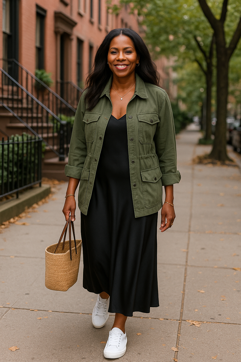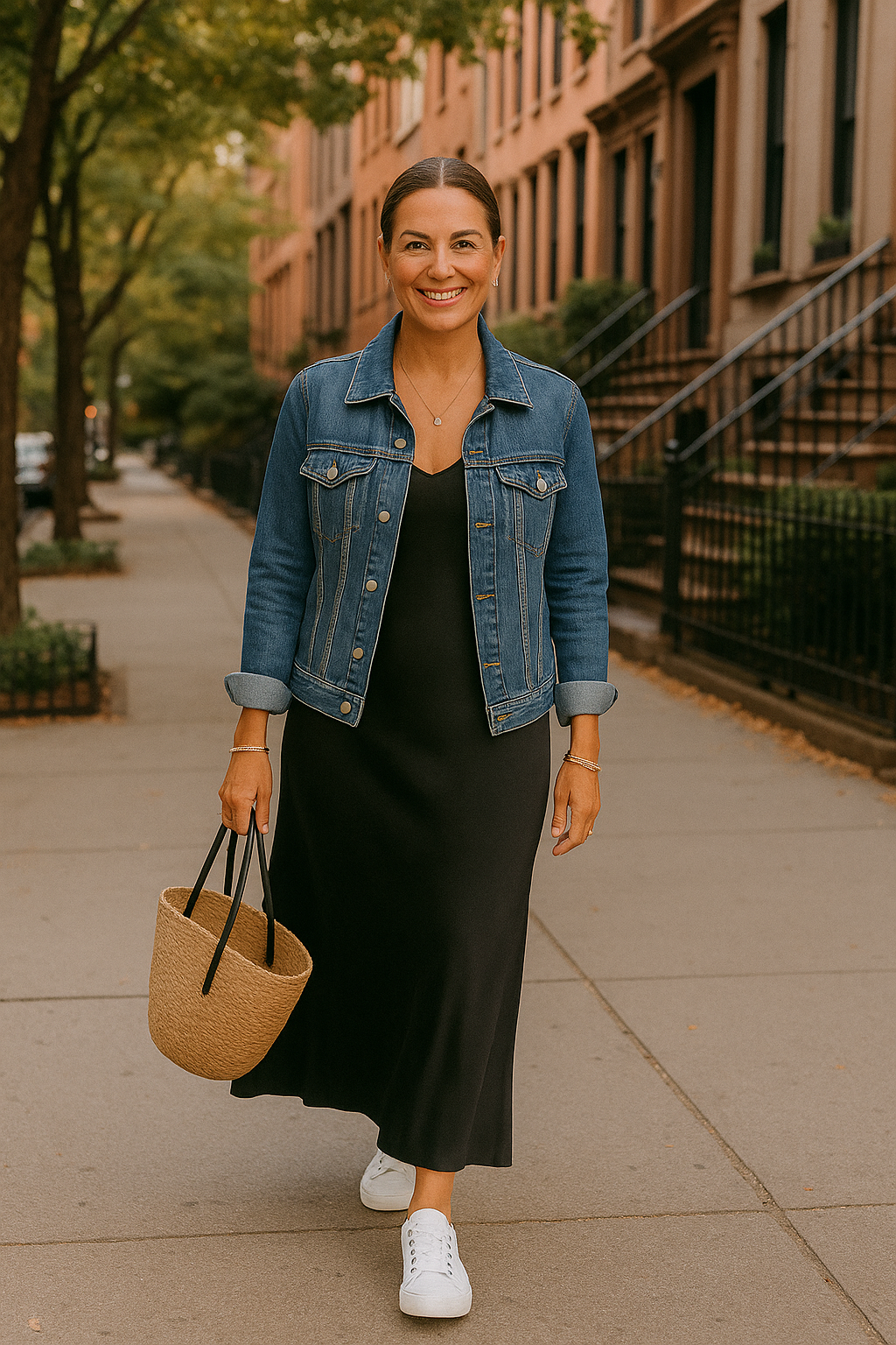A slip dress is the perfect choice for days when you want to look polished but still keep things casual—and when you want a break from your go-to jeans-and-tee combo. One of the easiest ways to dress it down is with sneakers. White sneakers, a wardrobe essential, are always a favorite because they’re chic and give any outfit a fresh, effortless vibe. While other colors work too, white sneakers add a timeless yet trendy touch. Their clean, simple style complements the slip dress without overwhelming it the way chunkier, busier sneakers might. And of course, no outfit is complete without a stylish hairstyle and a little jewelry to pull everything together.