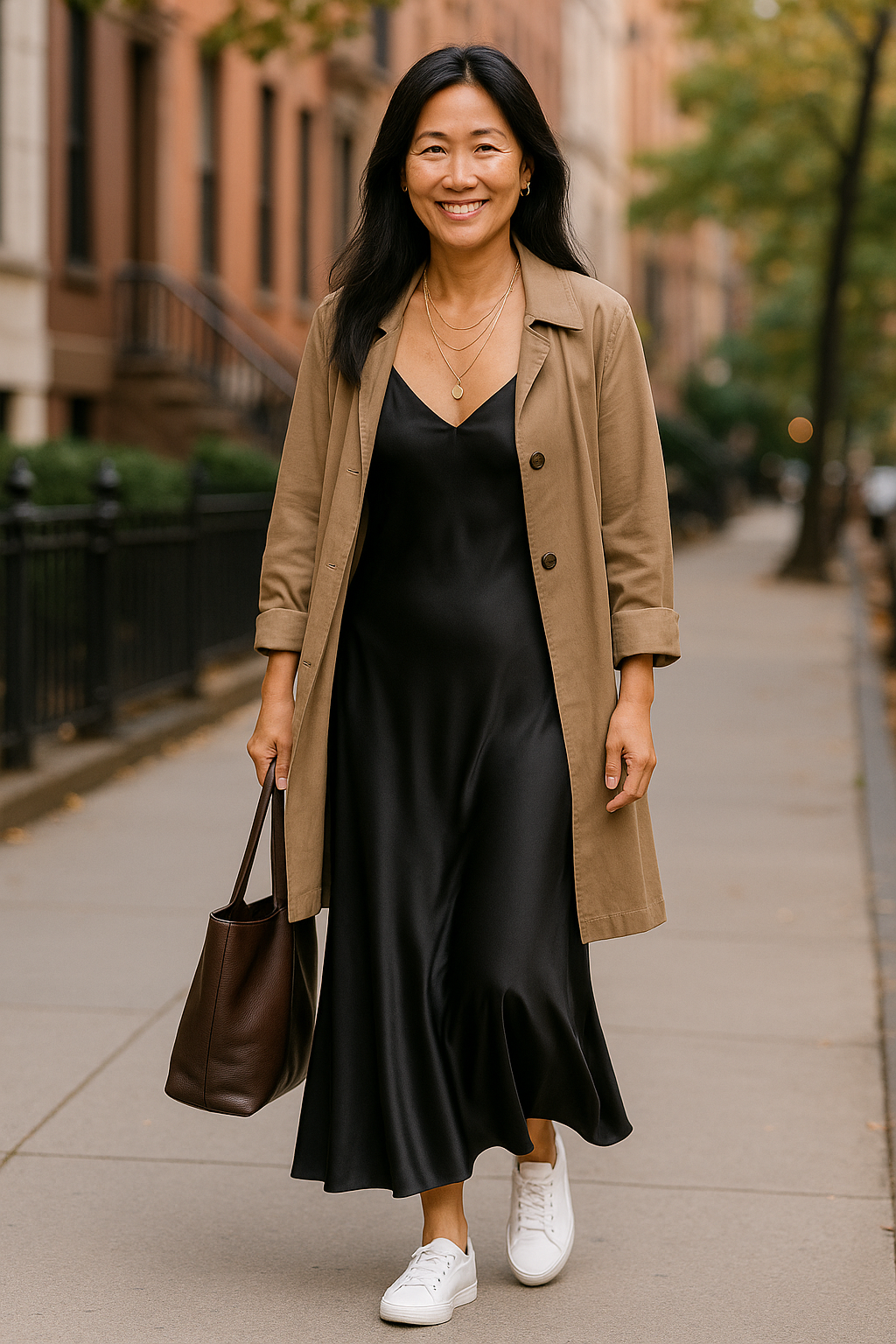 Styling a maxi slip dress with a longer layer, like a trench jacket, works because of the dress’s style. Since it’s more fitted through the upper body, it doesn’t completely disguise your shape. That small detail keeps the longer layer from overwhelming the look or creating a frumpy look, even when paired with flats or sneakers.