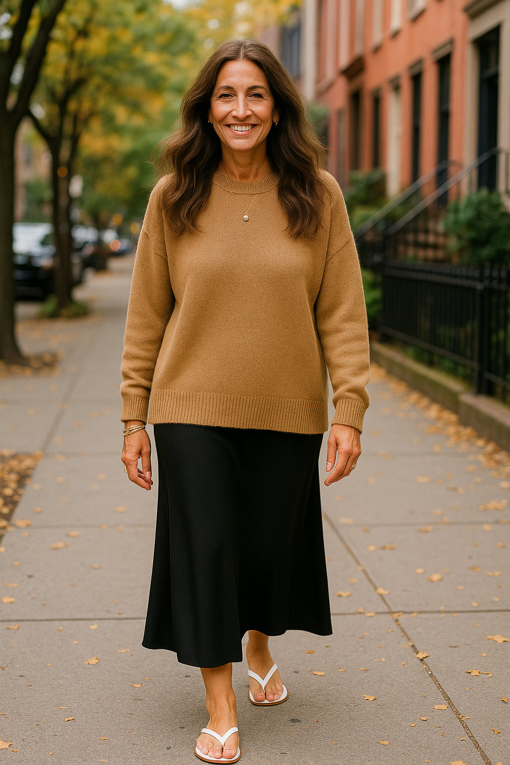 Sweater option two: go longer. This look is all about effortless, relaxed, and easy style. The key is balance—because while a long, loose sweater can look chic, the proportions have to be right to avoid feeling frumpy. Aim for an oversized or loose-fit style that hits around the upper thigh; any longer and it can overwhelm the slip dress. Flip-flops add to the laidback, effortless vibe, while your accessories and hairstyle finish the look. With easy, relaxed outfits like this, being intentional about your styling details matters most—your jewelry and hair are what pull everything together.
