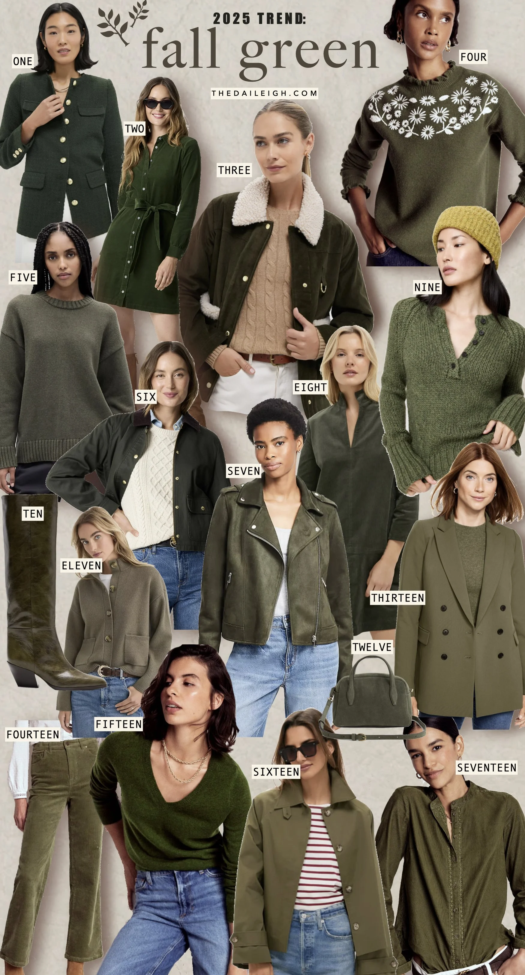 From soft sage to deep olive, shades of green feel especially fitting this time of year. While it’s a color you can wear year-round, it blends seamlessly with the rich tones and textures fall brings. This round-up highlights trending styles for the season—cozy knits, oversized layers, luxe textures, and structured silhouettes. Whether you’re layering green as the focal point, letting it stand out as the statement shade, or working it in subtly through accessories and shoes, there’s no shortage of ways to make this versatile color a staple in your fall wardrobe.